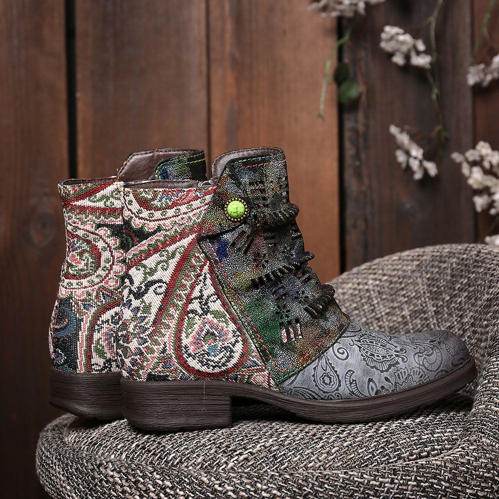 Retro Genuine Leather Splicing Fancy Pattern Zipper Flat Short Boots