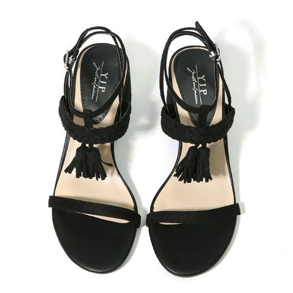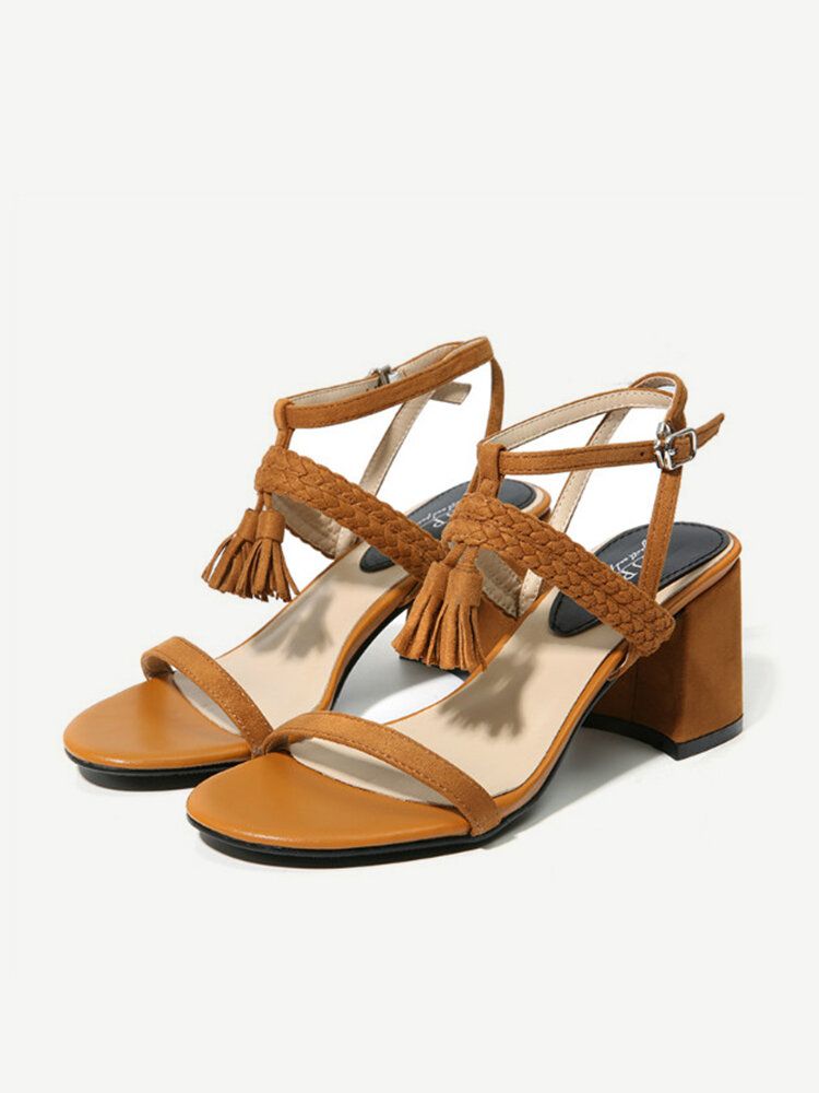 Tassel Woven Block Peep Toe Solid Buckle Strap Sandals