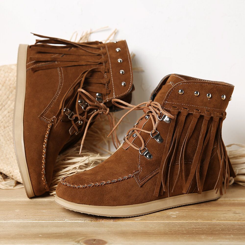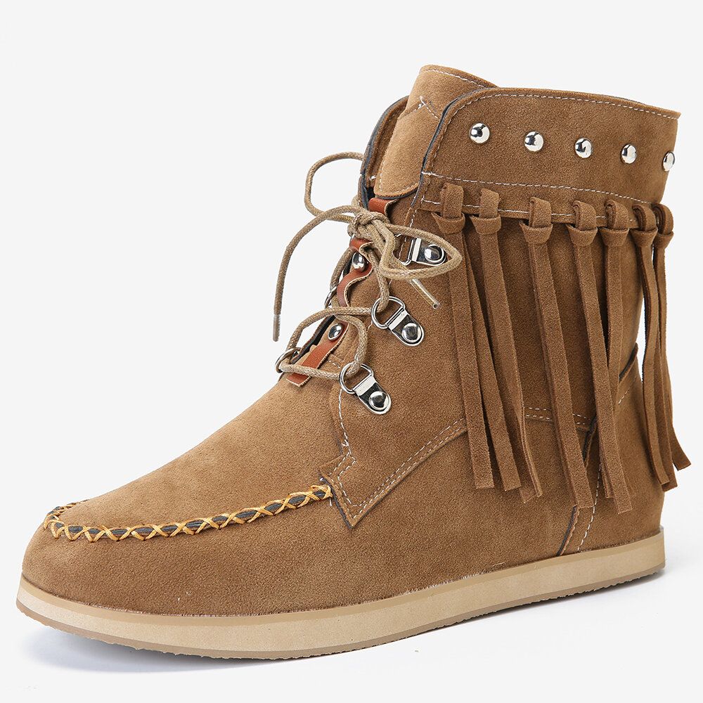 Large Size Women Comfortable Suede Metal Decoration Lace Up Tassel Flat Ankle Boots
