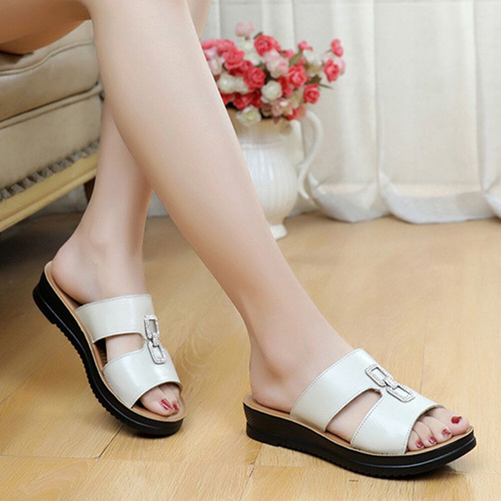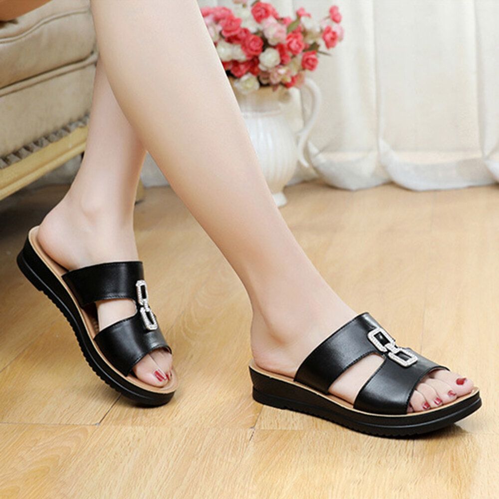 Women Beach Leather Rhinestone Hollow Soft Comfy Slide Slippers