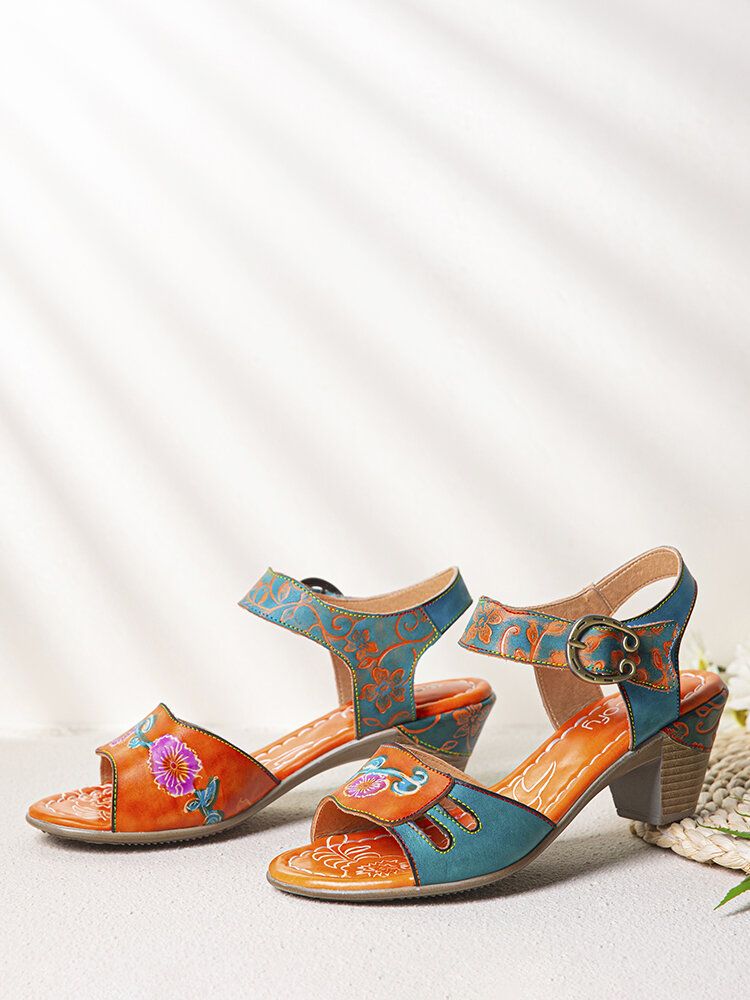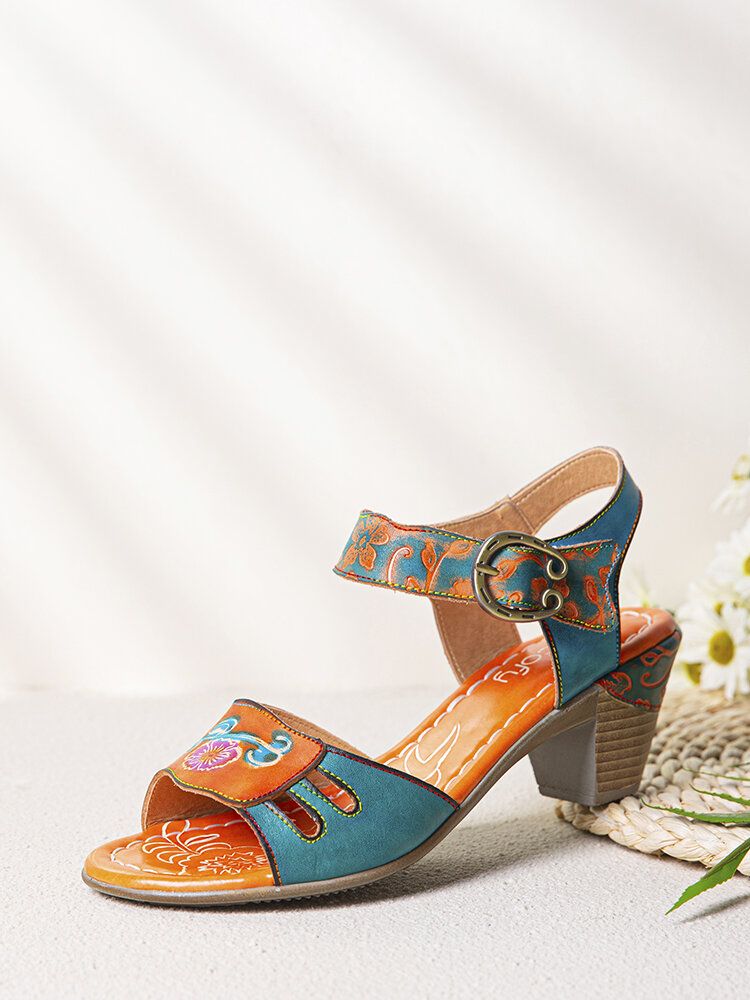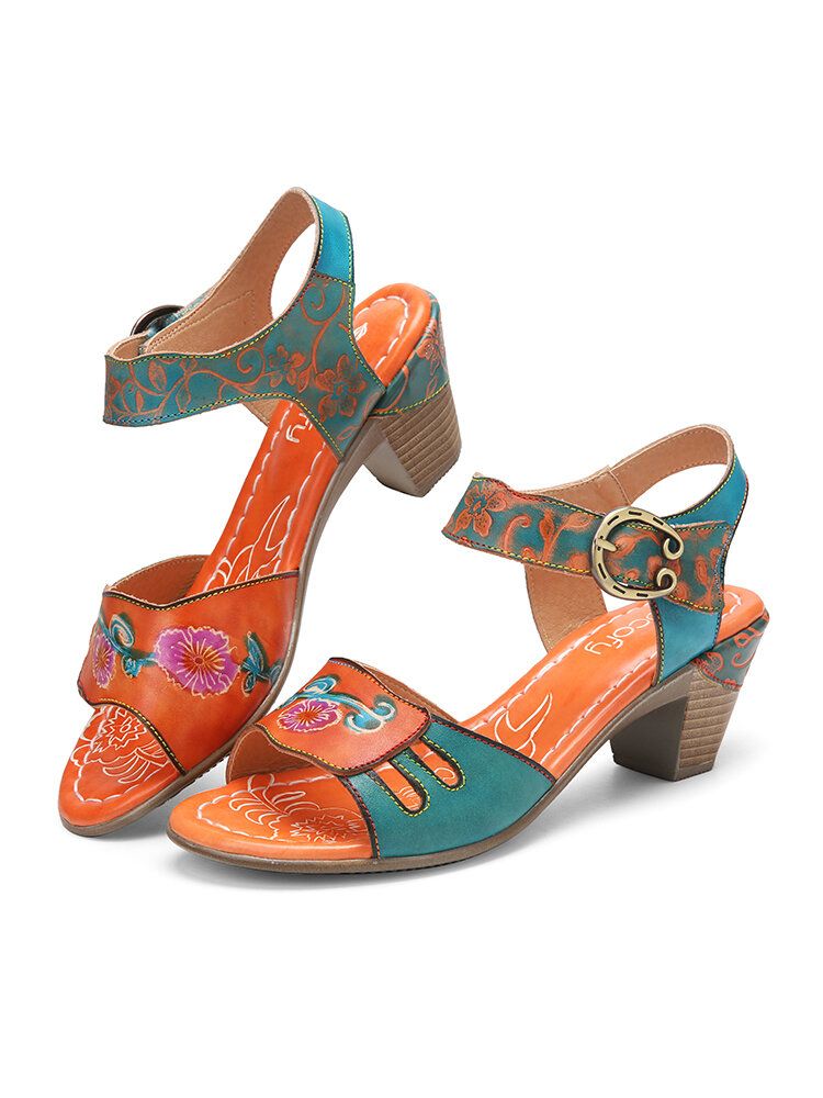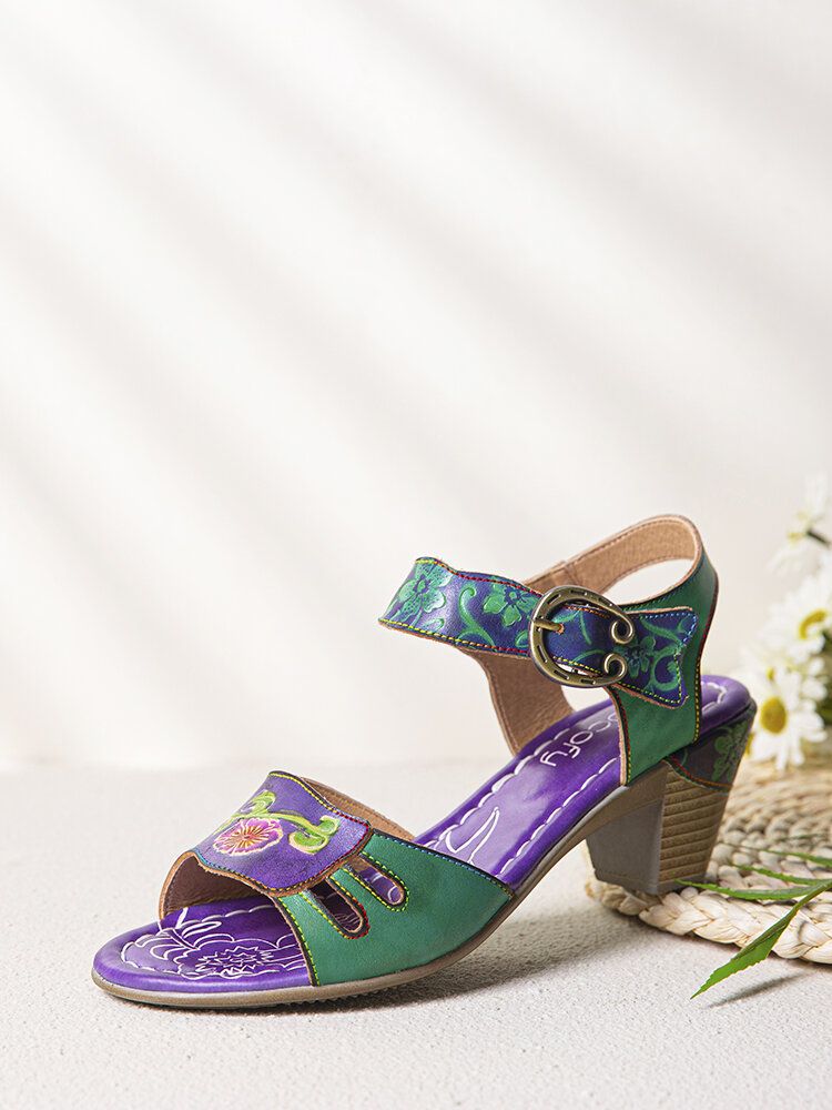 Elegant Floral Printed Splicing Cut-out Genuine Leather Hook Loop Chunky Heel Sandals