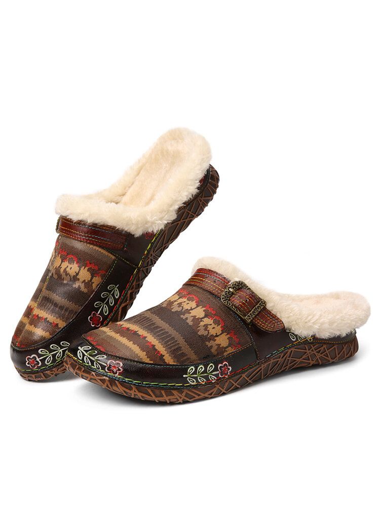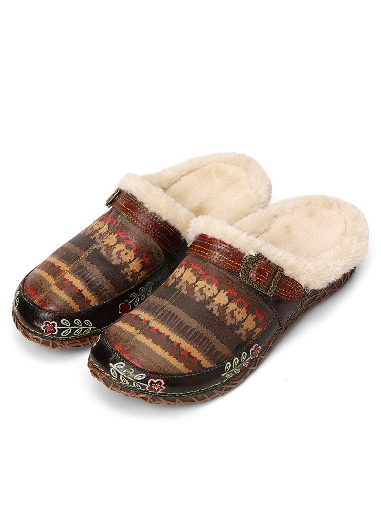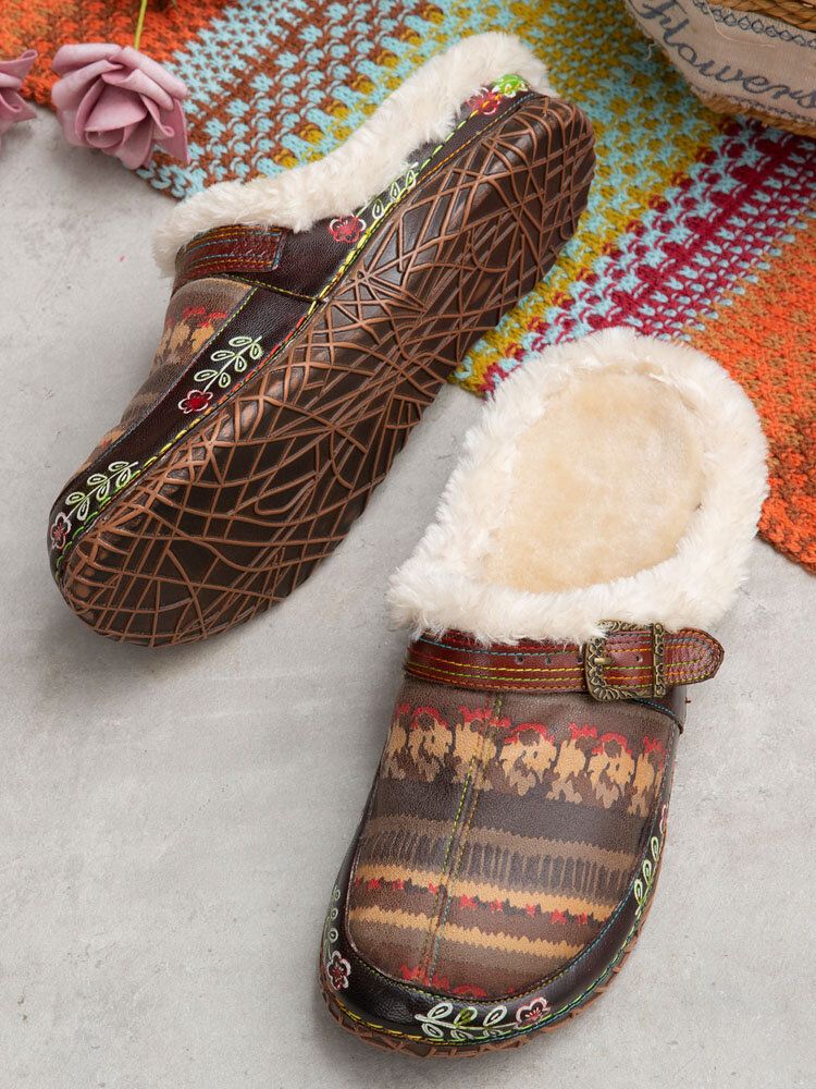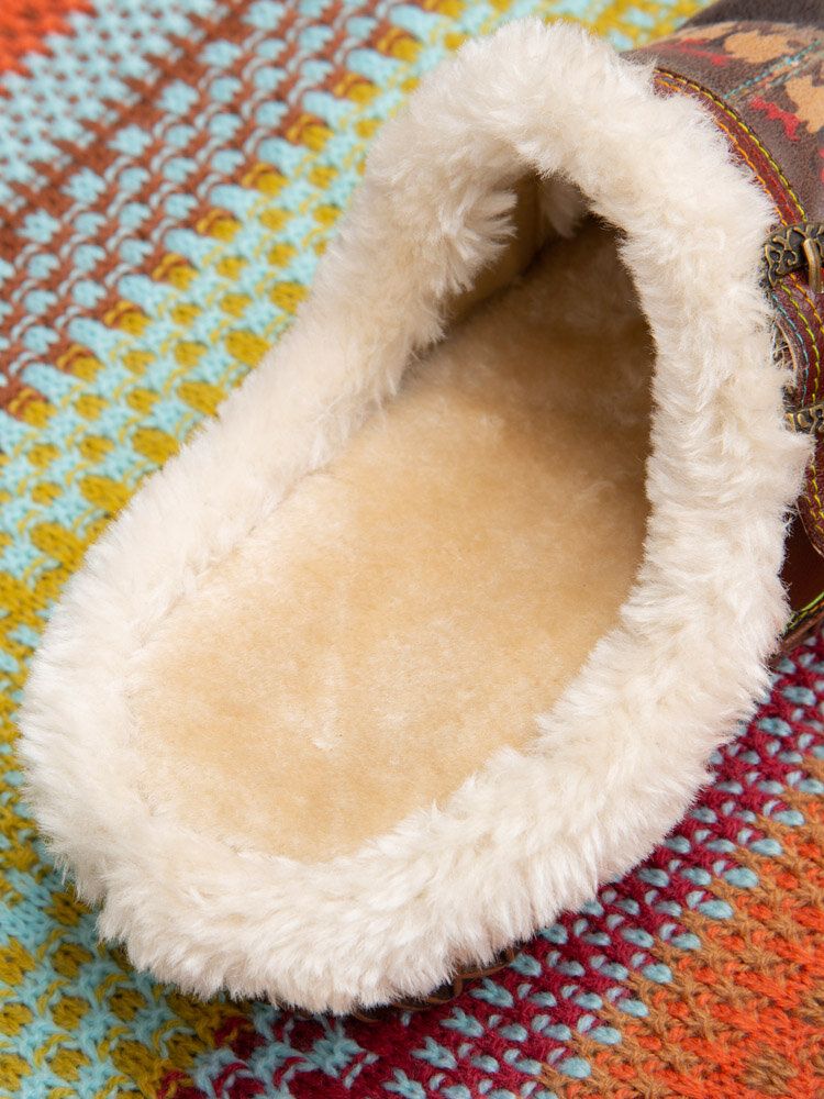 Ethnic Pattern Genuine Leather Soft Comfy Warm Fuzzy Casual Closed Toe Slippers