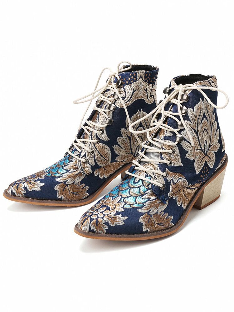 Large Size Women Summer Boots Pointed Toe Embroidered Lace Up Block Heel Short Boots