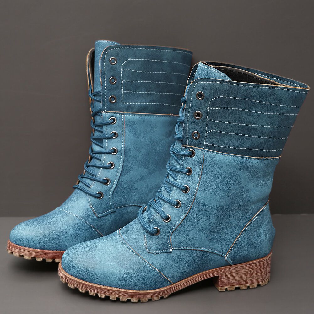 Plus Size Women Retro Pu Leather Lace Up Block Heel Short Boots