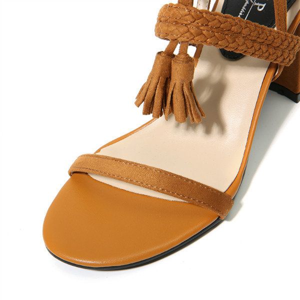 Tassel Woven Block Peep Toe Solid Buckle Strap Sandals