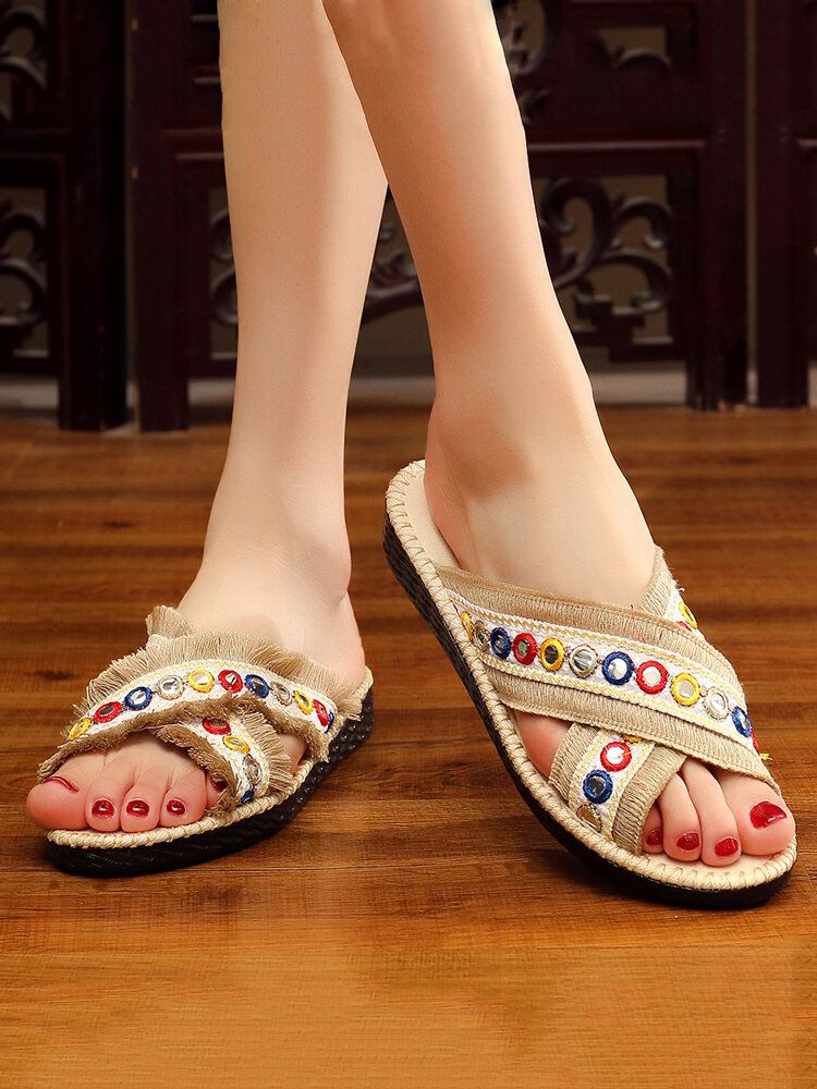 Women Folkways Circle Sequined Handmade Embroidered Peep Toe Slippers